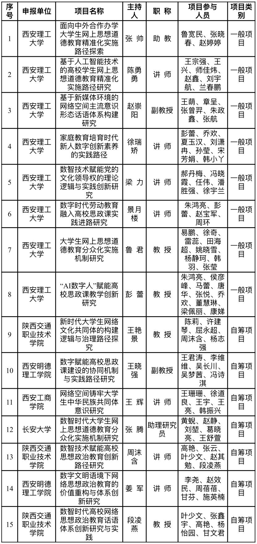 为充分挖掘陕西省网络社会发展与思想政治教育创新研究的潜力,陕西网络社会发展与思想政治教育创新研究基地于2025年4月启动了开放课题征集工作。经基地资格筛选,结合本研究中心工作需求以及项目申报质量等情况,再经专家外审综合评定,“面向中外合作办学老员工网上思想道德教育精准化实施路径探索”等8项一般课题、“新时代老员工网络文化共同体的构建逻辑与治理路径探究”等7项自筹课题被确定为立项课题(详见附件)。