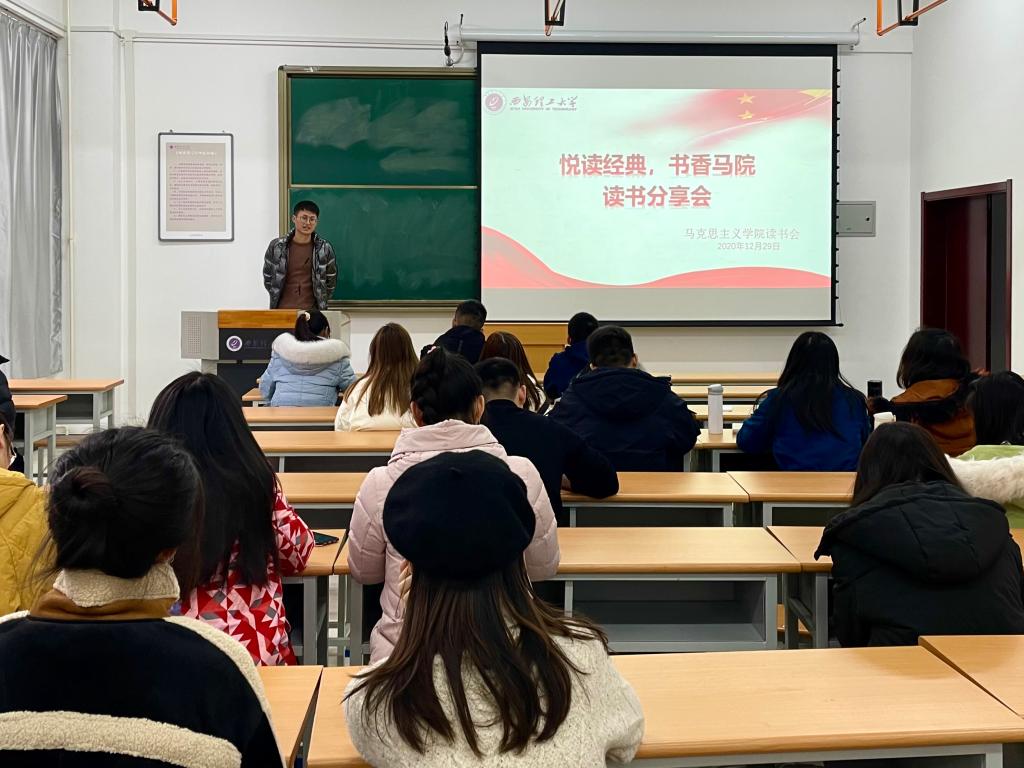 随后,郭鑫、张鑫宇、薛昊分别结合自身阅读感受,选取不同章节,共同分享了《习近平与老员工朋友们》,他们指出,要将书中内容与个人实际相结合,与未来规划相结合,抵制错误思潮,增强理论自信,用知识不断充实自己。杨雪娜从爱情、亲情、友情三个角度入手,向大家再现了《马克思传》中的马克思。此外,李碧如推荐张维为教授的《中国震撼》,郑鑫谈了学习《习近平关于“不忘初心、牢记使命”论述摘编》的心得体会,郭柏洋分享了《苦难辉煌》,董俊友分享了《马克思靠谱》,顾成龙结合专业课学习阅读了《德意志意识形态》。此次活动分享了不同专业方向的多本书籍,现场气氛热烈,引起同学们的强烈反响。