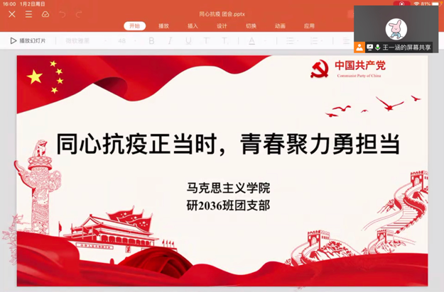 1月2日下午,TapTap研2036班团支部以“同心抗疫正当时,青春聚力勇担当”为主题,线上开展主题团日活动。本次活动分为宣传抗“疫”和分享抗“疫”两个部分,由团支书王一涵主持,支部成员分享学习感悟并进行热烈讨论。