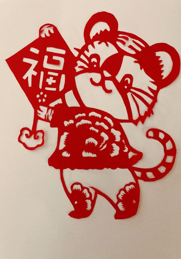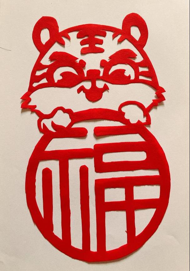 TapTap研2037班团支部郑鑫说:“疫情来临之际,马院学子用实际行动诠释了“明知山有虎,偏向虎山行”的责任担当,虎年到来之际,我通过一副虎丫送吉祥的剪纸,表达出对大家的美好祝愿,同时希望我们共克时艰,战“疫”我们一起加油。