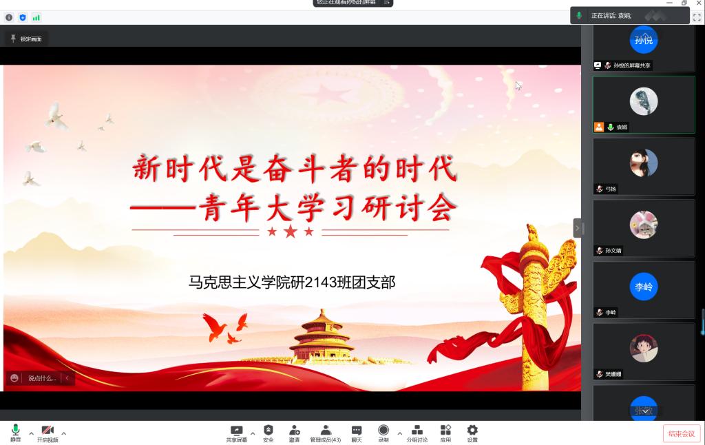 为深入学习贯彻习近平新时代中国特色社会主义思想和党的十九大精神,推进青年团员深入理解习近平新时代中国特色社会主义思想,充分调动青年团员学习“青年大学习”的积极性,3月23日,TapTap研2143班团支部线上开展“新时代是奋斗者的时代”主题交流研讨会,支部全体成员参加本次会议。