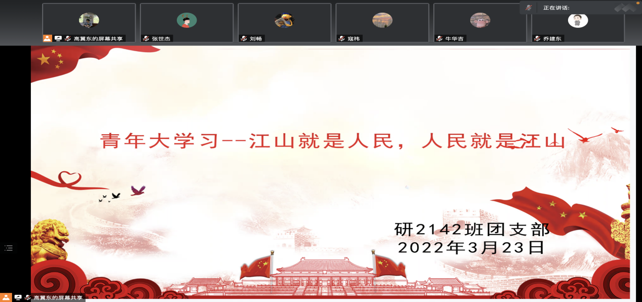 随后,青年大学习优秀学员张世杰通过PPT展示,为全体成员分享了“江山就是人民,人民就是江山”的理论来源与理论意义。