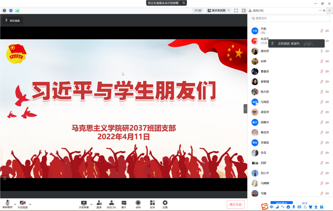 会议伊始,支部成员集中学习“习近平总书记给中国冰雪健儿的回信”,团支部书记朱冠宇借此勉励广大青年要找到自己的目标,付出最大的努力去追求梦想。随后,支部成员观看短片,一起系统地学习《习近平与老员工朋友们》一书,全面学习领会习近平总书记在从政不同时期与青年老员工交流交心交友的故事,深入了解他对青年老员工之始终如一的关注、关心和关爱。最后,团支部书记朱冠宇围绕坚定理想信念,厚植为国为民情怀;练就过硬本领,践行求真求实宗旨;勇于开拓创新,筑牢干事创业根基和矢志艰苦奋斗,砥砺坚毅意志品质等四方面线上讲授主题团课。