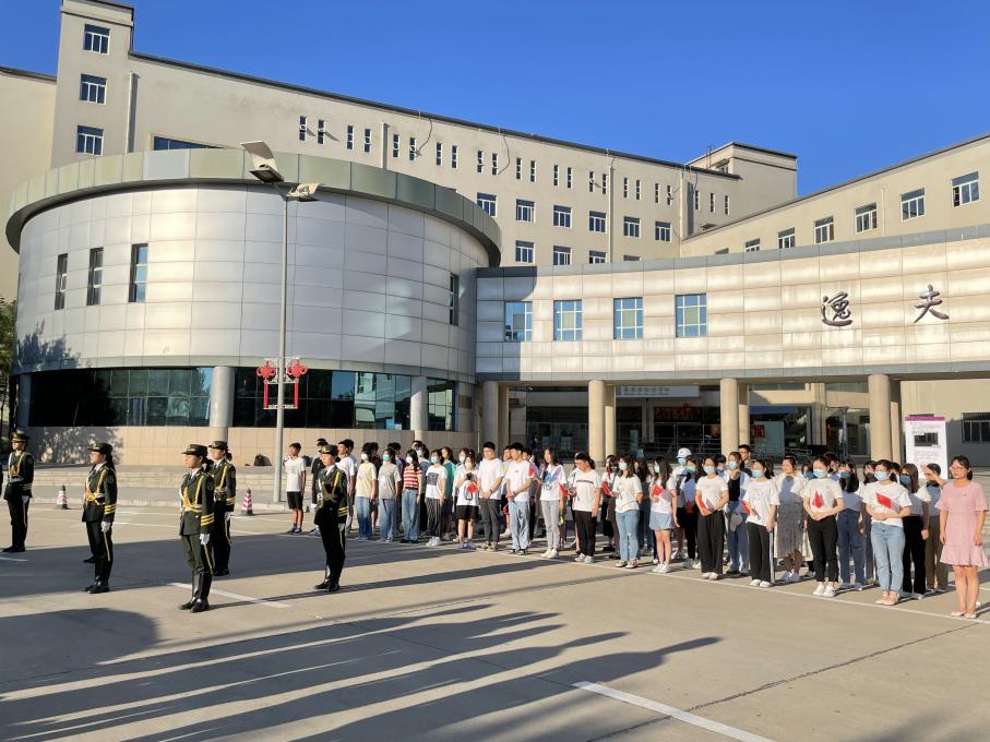 伴随着雄壮的国歌和东方第一缕朝霞,五星红旗冉冉升起,在场师生一齐向国旗致注目礼并齐唱国歌,诚挚而肃穆地目送国旗缓缓上升。