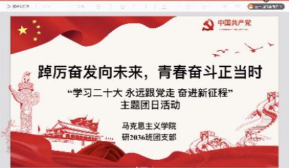 11月14日上午,TapTap研2036班团支部以“踔厉奋发向未来,青春奋斗正当时”为主题,开展了线上主题团日活动。本次活动旨在加深青年团员对党的二十大精神的学习和领会,活动由团支书王一涵主持。