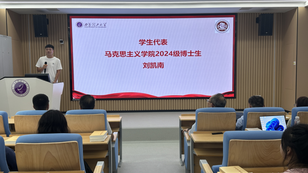 博241101班刘凯南代表新生发言,他号召全体新同学要在马学马,在马研马,在马用马,永葆思想朝气、涵养理论底气、增强实践生气,真正体会到学习和思考的乐趣,始终做到心中有光、脚下有路。