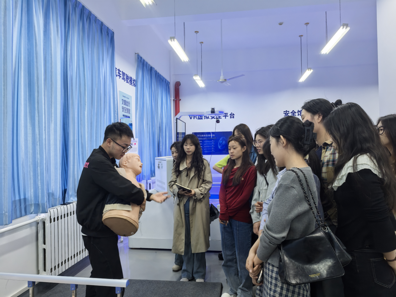 在VR安全体验区,借助虚拟现实技术,使同学们置身于宿舍火灾、交通安全事故、防恐防震等突发场景之中。逼真的模拟环境让大家深刻感受到危险来临时的紧张氛围,同时也系统学习了各类突发事件的应对流程与处置技巧,极大地提升了安全技能。在交通安全区,AR模拟驾驶器是热门体验项目,同学们通过模拟驾驶,亲身体验驾驶过程中可能遭遇的突发状况,学习自救知识,进一步强化了安全出行的理念。在应急救援区,通过模拟演练,同学们学习了自动体外除颤器(AED)的正确使用方法、海姆立克急救法以及伤口包扎等实用急救技能。网络安全区精心设计的“沉浸式受骗”体验,生动揭露了常见的网贷陷阱、电信诈骗等网络安全隐患。安全场景模拟区搭建的真实宿舍场景和实验室场景,为同学们提供了排查安全隐患的实践机会。大家认真查找场景中的潜在危险点,有效提升了安全防范意识。在安全知识科普区,同学们以互动游戏、知识抢答等趣味形式,生动普及政治安全、国土安全、经济安全等八大领域的安全常识。