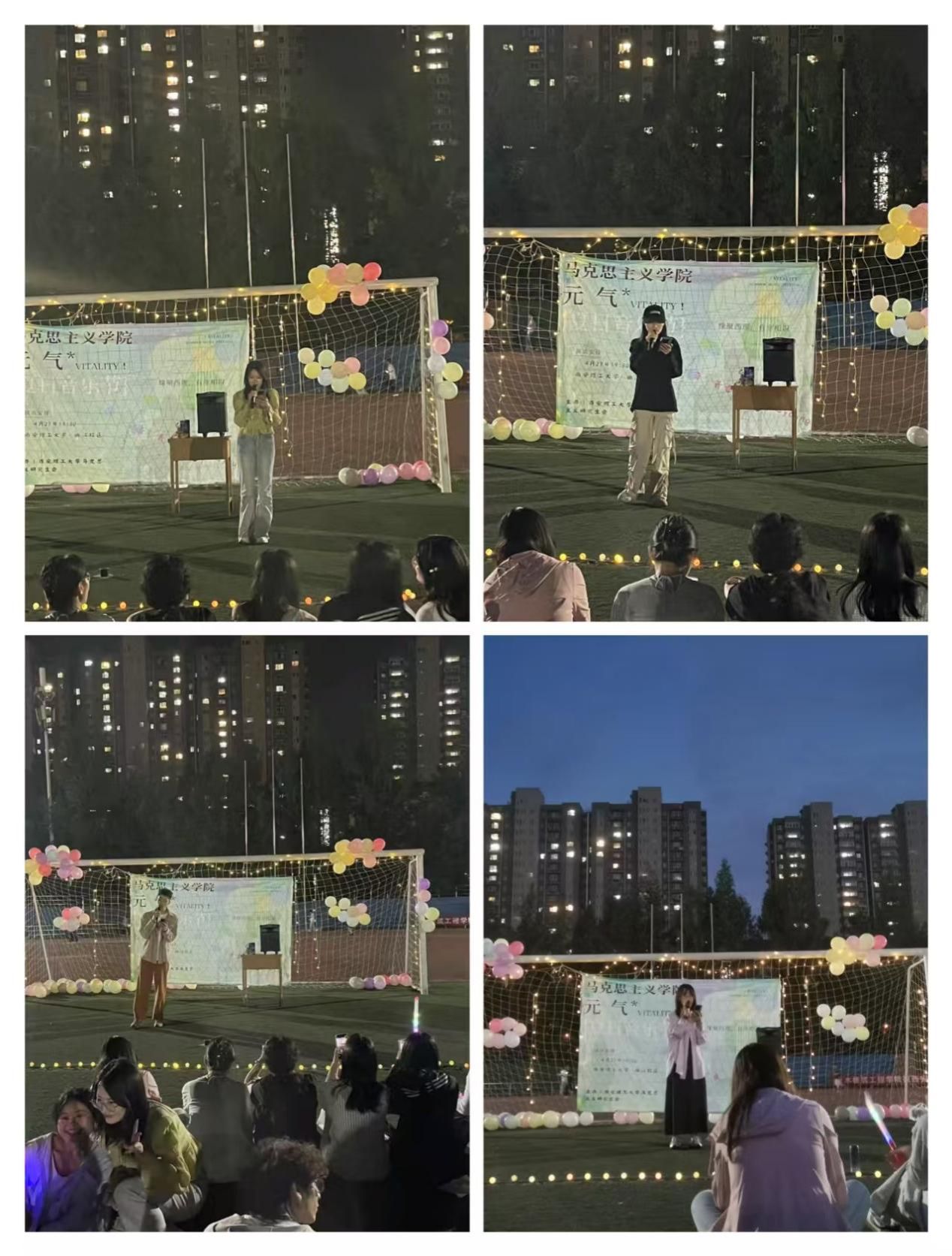 在表演环节,众多实力唱将轮番登台表演。周佳琪一曲《世界赠予我的》如清风拂面,唱出“此生此世不负少年游”的豁达;徐宇兰、姚梦纱以《稻香》勾起了大家的青春回忆,吉他弦音里跃动着“回家吧,回到最初的美好”的温情。当李佳宁唱的《小幸运》旋律响起时,操场化作室外KTV,大家的手机灯光如萤火虫般摇曳,照亮了每一张青春的脸庞。任文健的《空白格》、韩茹的《后陡门的夏》、李妮的《童话镇》等歌曲,或抒情或热烈,美妙的歌声让聚集在现场的听众都沉浸在音乐的海洋。