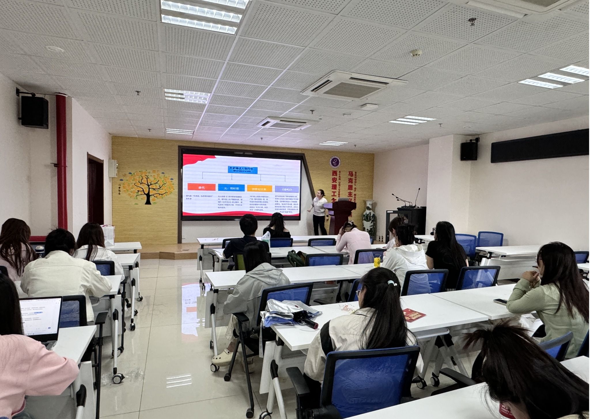 活动开场,公司马晓红老师以《哪吒之魔童降世》为蓝本,为同学们做以“树立和突出各民族共享的中华文化符号和中华民族形象”为主题的讲座。马老师围绕“中华文明标识”与“铸牢中华民族共同体意识”两方面,抛出一系列关键问题,如文化媒介怎样助力铸牢中华民族共同体意识、国产动画如何融入中华文明标识等,引发同学们深度思考。接着,她深入剖析电影中的哪吒形象,讲述了电影中主要人物形象的历史演变、传统服饰符号、听觉符号,以及哪吒面对命运的抗争、自我身份的探索和人际关系处理的成长历程,以上内容都展现了中华文化的深厚底蕴。